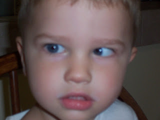 The other day Chris was trying to teach the kids how to cross their eyes, mainly because he thinks it is hilarious. It is his all time favorite when someone can have one crossed and the other looking at you. He was putting his finger between their eyes and having them look at it and all sorts of different tactics, when out of nowhere Jed does it on his own. And then Jed pulls the granddaddy of all talents and crosses one and leaves the other looking at us. Of course Chris thought is was great, so now Jed does it any old time he wants, but mostly when he doesn't want to eat, or is bored sitting at the table. I must admit, that he ends up not finishing his meal most of the time.